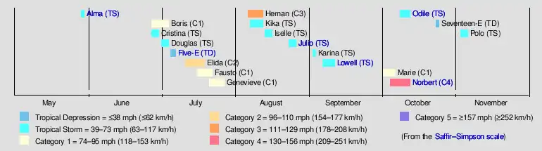 Tropical Storm Odile (2008)Hurricane Norbert (2008)Tropical Storm Lowell (2008)Tropical Storm Julio (2008)Tropical Depression Five-E (2008)Tropical Storm AlmaSaffir–Simpson scale