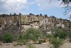 The best known archeological site within the municipality proper is Yagul, a former city-state associated with the Zapotec civilization. The site was declared one of the country's four Natural Monuments on 13 October 1998.[26] The site is also known locally as Pueblo Viejo (Old Village) and was occupied at the time of the Spanish Conquest. After the Conquest the population was relocated to modern Tlacolula where their descendants still live.[27][28] Yagul was first occupied around 500–100 BC. Around 500–700 AD, residential, civic and ceremonial structures were built at the site. However, most of the visible remains date to 1250–1521 AD, when the site functioned as the capital of a Postclassic city-state.[29] The site was excavated in the 1950s and 60s by archaeologists Ignacio Bernal and John Paddock.[27][30]