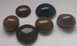 The true toadstone was taken by contemporary jewellers to be no bigger than the nail of a hand and they varied in colour from a whitish brown through green to black, depending on where they were buried.[2] They were supposedly most effective against poison when worn against the skin, on which occasion they were thought to heat up, sweat and change colour.[3] If a person were bitten by a venomous creature a toadstone would be touched against the affected part to effect a cure.[4] Alternatively Johannes de Cuba, in his book Gart der Gesundheit of 1485, claimed that toadstone would help with kidney disease and earthly happiness.[5]
