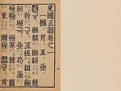 Tongguk chŏngun (Korean: 동국정운; Hanja: 東國正韻; lit. 'Standard Rhymes of the Eastern State')[a] is a rhyme dictionary that sets out standard phonetics for the Sino-Korean pronunciations of Chinese characters (Hanja). It was completed in September 1446 and compiled in 1447, being published, printed, and distributed the following year, under the instructions of Sejong the Great from the Joseon Dynasty, and serves as a companion volume to his Hunminjeongeum.[1][2]