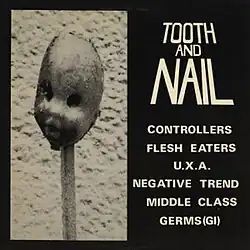 Tooth and Nail is a seminal compilation album[1] featuring six early Californian punk rock bands: the Controllers, the Flesh Eaters, U.X.A., Negative Trend, Middle Class, and the Germs.[2][3][4]