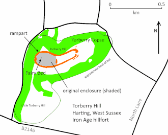 Torberry Hill (also spelled Tarberry Hill and Torbery Hill) is an Iron Age hillfort in the county of West Sussex, in southern England. It is a Scheduled Ancient Monument, with a list entry identification number of 1015966. The hill fort is located within the parish of Harting, within the South Downs National Park.[1] The hill includes the remains of an Early Iron Age univallate hill fort (c. 800–300 BC), a Middle Iron Age promontory fort (c. 300–100 BC) and a post-medieval post mill. The hill is a chalk spur projecting northwards from the South Downs.[2][3]
