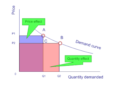 When the price changes from to the magnitude of the price effect is represented by the rectangle and the magnitude of the quantity effect is given by rectangle . The price effect is the loss of revenue from selling the original quantity at the lower price; the quantity effect is the added revenue earned at the new price on the newly induced units sold.
