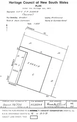 Title passed to the Perpetual Trustee Co. Ltd. as executor of Cameron's will on 24 February 1906. E. H. Cowdery surveyed the land for auction sale in 10/1906. Auction of the Toxana Estate, with its surrounding land divided into 25 lots was held on 3 November 1906.[16] Toxana stood on a triple lot (Lot 7) aside three lots to its east facing Windsor Street.[1]
