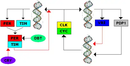 The TTFL was first discovered in Drosophila, and the system shares several components with the mammalian TTFL. Transcription of the clock genes, Period (per) and Timeless (tim), is initiated when positive elements Cycle (dCYC) and Clock (dCLK) form a heterodimer and bind E-box promoters, initiating transcription. During the day TIM is degraded; light exposure facilitates CRY binging to TIM, which leads to TIM's ubiquitination and eventual degradation.[7] During the night, TIM and PER are able to form heterodimers and accumulate slowly in the cytoplasm, where PER is phosphorylated by the kinase DOUBLETIME (DBT). The post-transcriptional modification of multiple phosphate groups both targets the complex for degradation and facilitates nuclear localization. In the nucleus, the PER-TIM dimer binds to the CYC-CLK dimer, which makes the CYC-CLK dimer release from the E-boxes and inhibits transcription. Once PER and TIM degrade, CYC-CLK dimers are able to bind the E-boxes again to initiate transcription, closing the negative feedback loop.[8]