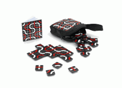 The game is played with a set of identical square tiles. One side of the tile has red and white straight lines and the other red and white curves.