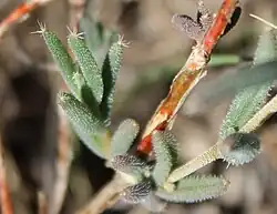 In addition, Trichodiadema pomeridianum has much shorter leaves (only c.15 mm), while Trichodiadema rogersiae is a smaller plant with thicker, stronger branches. There are also fewer diadem bristles on both Trichodiadema pomeridianum (only 3-8) and Trichodiadema rogersiae (only 5-9). [1][2]