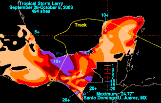 Tropical Storm Larry was one of eight storms to hit Mexico from either the Atlantic Ocean or the Pacific Ocean, the highest since the record of nine in 1971.[8] The National Hurricane Center expected the storm to produce a storm surge of 3 to 5 feet (0.91 to 1.52 m), with high waves on top,[9] though no official surge readings were reported.[2] The highest recorded winds on land were 59 mph (95 km/h) in El Alacrán in Tabasco. The worst of Larry's effects came from its rainfall, peaking at 24.77 inches (629 mm) in Upper Juarez in southeastern Mexico.[10] The highest 24-hour rainfall total was 9.6 inches (240 mm) in Tortuguero, Chiapas,[8] while several other locations reported over 4 inches (100 mm) in 24 hours.[1]