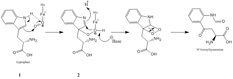 Early proposals for the mechanism of tryptophan oxidation were presented by Sono and Dawson.[19] This suggested a base-catalysed abstraction mechanism, involving only the ferrous (FeII) heme. It is assumed that TDO and IDO react by the same mechanism, although there is no concrete evidence for that. In IDO, a ferryl heme (FeIV) has been identified during turnover.[20][21] Mechanistic proposals have therefore been adjusted to include the formation of ferryl heme during the mechanism.[22] TDO is assumed to react in the same way, but a ferryl heme has not been observed in TDO. See also discussion of mechanism for indoleamine 2,3-dioxygenase.