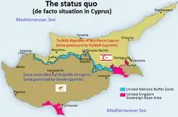 The two-state solution[1] for the Cyprus dispute refers to the proposed permanent division of the island of Cyprus into a Turkish Cypriot State in the north and a Greek Cypriot State in the south, as opposed to the various proposals for reunification that have been suggested since the island was split into two by the 1974 Turkish invasion. The two-state solution would entail the legalisation of the status quo, where Greek Cypriots govern the southern part of the island and Turkish Cypriots govern the northern part, the latter of which is currently not recognised by any country other than Turkey.
