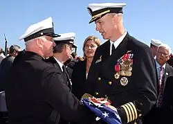 U.S. Navy Command Master Chief Charles L. Dassance presents the ensign to U.S. Navy Capt. Todd A. Zecchin, commanding officer of USS John F. Kennedy, during the ship's decommissioning ceremony.
