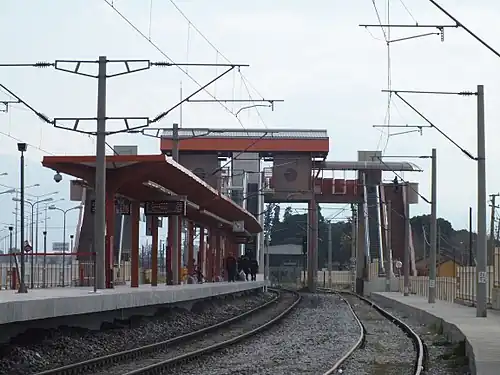 Ulukent station was originally opened on 10 October 1865, by the Smyrna Cassaba Railway, with the opening of their railway from Basmane to Manisa.[2] In 1934, the Turkish State Railways bought the railway, as part of the government's nationalization program.[2] A second-track was added to Ulukent in 1995, when TCDD extended its double-track section from Çiğli to Menemen to connect to the newly built Menemen-Aliağa railway.[3] Ulukent remained as a stop on the line until 1999, when plans to expand the station as part of the new Aliağa-Menderes railway corridor were put forward.[4][5][6] The station was electrified in 2002 and an island platform and overpass was completed in 2004.[7] The station was then serviced by regional and some intercity trains to Aliağa, Uşak, Afyonkarahisar, Bandırma and Ankara.