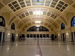 The abandoned Union Station was added to the National Register of Historic Places in 1980.[5] Some peak-hour MBTA Commuter Rail Framingham/Worcester Line service was extended to Worcester on September 26, 1994. Off-peak service was gradually added; weekend service began on December 14, 1996.[7] Union Station was acquired by the Worcester Redevelopment Authority in 1994 and completely renovated at a cost of $32 million. The station was restored and renovated by Finegold Alexander & Associates. The Grand Hall (the original waiting room), had its elliptical stained-glass ceilings, interior marble columns, and mahogany wood trim restored. Fiberglass towers were constructed to replace those removed in 1926.[9][5] Amtrak and MBTA service began using Union Station on June 20, 2000.[7][5]