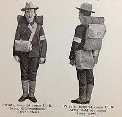 In spite of the objective behind the creation of the Hospital Corps, its members were mainly trained for peacetime tasks. Instructions were given in cooking, horseback riding, horse care, first aid, anatomy, physiology, nursing and pharmacy.[36] In 1909, the training contained a basic course of discipline and the duties of a soldier, drill and field work, animal care and horseback riding, anatomy and physiology, first aid and personal and camp hygiene, and nursing for all candidates, and a complete course for those with special aptitude, which added army regulations, cooking, Materia medica and pharmacy, elementary hygiene, and clerical work to the basic course.[37] Examination for promotion to Acting Hospital Steward tested the candidates knowledge in the principles of arithmetic, in orthography and penmanship, regulations affecting enlisted men, care of sick, ward management, minor surgery, hospital corps drill and first aid, ordinary modes of cooking and elementary hygiene, as well as evaluating the candidates physical fitness, moral character and general aptitude.[38] The later examination for promotion to Sergeant had the same content.[33]