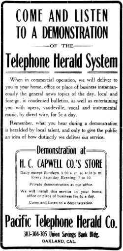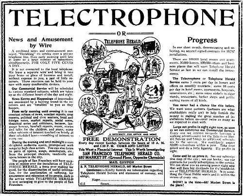 - ^ "New Invention Enables One to Hear News, Concerts, Lectures and Sermons at Home", San Francisco Call, September 10, 1911, page 19.