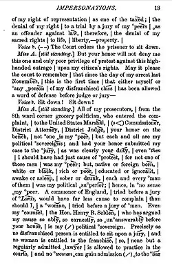 Repeatedly ignoring the judge's order to stop talking and sit down, Anthony protested what she called "this high-handed outrage upon my citizen's rights", saying "you have trampled under foot every vital principle of our government. My natural rights, my civil rights, my political rights, my judicial rights, are all alike ignored."[2] She castigated Justice Hunt for denying her a trial by jury. She also declared that even if he had allowed the jury to discuss the case, she still would have been denied her right to a trial by a jury of her peers because women were not allowed to be jurors. She said that in the same way that slaves obtained their freedom by taking it "over, or under, or through the unjust forms of law", now for women to get their right to a voice in government, they must "take it; as I have taken mine, and mean to take it at every possible opportunity."[2]