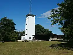 On the summit plateau there is a shelter as well as the 23-metre (75 ft) Volkmarsberg tower,[3] a stone observation tower built in 1930, from which one has a far-reaching view over the entire Ostalbkreis.[4] In rare temperature inversion conditions the 180-kilometre (110 mi) distant Zugspitze can be seen.[5]
