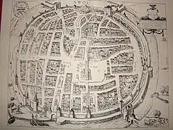 Map of Zwolle in 1572 shows two "water gates", one for the smaller "Kleine Aa", and the Waterpoort for the "Grote Aa". A ship is moored in front of what would later become the Vrouwenhuis.