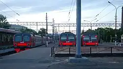 A number of railways pass through the district. The main line between St. Petersburg and Helsinki, the Riihimäki – Saint Petersburg Railway, runs through Vyborg. Another line connecting St. Petersburg and Vyborg follows the coastline of the Gulf of Finland, passing Primorsk. Vyborg is connected to Khiytola via Kamennogorsk. This is the old Vyborg–Joensuu railroad. In Kamennogorsk, a railway branches up north to Svetogorsk; its stretch beyond Svetogorsk to the state border is disused. All these railways are served by suburban trains originating from the Finland Station of St. Petersburg and from Vyborg. In addition, there are daily connections between St. Petersburg and Helsinki.