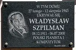 - ^ "Tablica przypomni ocalenie Szpilmana". tvp.info. 4 December 2011. Retrieved 8 June 2012.