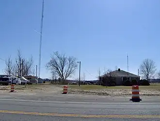 WIMX transmitter site and former studio building at 1201 Fremont Pike, Woodville, Ohio. The building at the right of the tower served as its studio location from its beginnings in 1988 to 1993.
