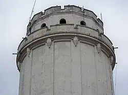 The 12-sided tower is 134 feet (41 m) tall, with walls 18 inches (460 mm) thick, and a capacity of 1,000,000 US gallons (3,800,000 L; 830,000 imp gal). The tower is topped by crenellations and 12 arched windows. It was constructed using a 14-day continuous pour.[3]