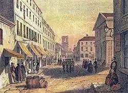 A view of Main Street, Gibraltar in the early 19th century; it was permeated with foul smells from sewage trapped under the roadway