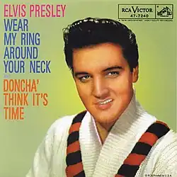 "Wear My Ring Around Your Neck" is a song written by Bert Carroll and Russell Moody, performed by Elvis Presley, which was released in 1958. It was particularly notable for breaking a string of ten consecutive number 1 hits for Presley achieved in just two years. Although it was Presley's 6th number-one hit in the American R&B Charts, it only peaked at number 2 on the American Pop Charts.