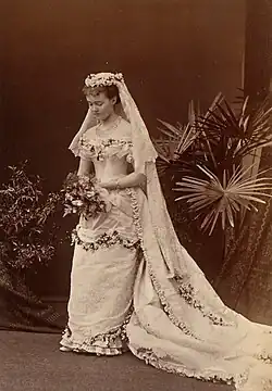 The bride wore a heavy white satin dress, with a band of lace ten centimeters wide encircling the waist.[1] The skirt was sewn with lace 30 centimetres (12 in) wide and decorated with myrtle-leaves, the emblem in Germany of the bridal state. The train was 4 metres (13 ft) long and surmounted by a lace flounce one meter in width made in Silesia, in which a sprig of myrtle was fixed. The bridal veil was about 3 metres (9.8 ft) square, made of point d'Alençon lace, the design representing orange blossoms, roses, and myrtle-leaves intertwined.[1]