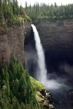 At the end of the last ice age approximately 10,000 years ago, massive floods from the melting glacial ice carved deep canyons into the underlying plateau-capping lava flows.[4] Most of these canyons contain rivers such as the Murtle and Clearwater, and waterfalls such as Canim Falls, Moul Falls, Spahats Falls and the 141 m (463 ft) high Helmcken Falls.[4] The faces of the basaltic lava flows and waterfalls remain vertical due to the nature of the basaltic lava flows.[4] Basaltic lava shrinks as it cools and forms vertical columns of rock called columnar basalt.[4] More recently, the southern end of the volcanic field has experienced continuous volcanic activity since the end of the last ice age. This volcanic activity occurred in three areas; Spanish Creek, Ray Lake and Kostal Lake which were followed by lava fountain eruptions creating cinder cones and lava flows.[6]
