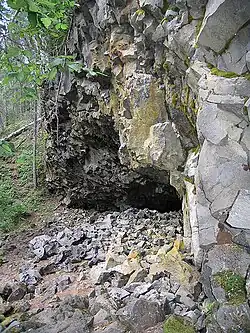 Eruptions near Ray Lake built a cinder cone known as Dragon Cone and concluded with an approximately 16 km (9.9 mi) long ʻaʻā lava flow that has been radiocarbon dated at about 7,600 years old.[1] This lava flow, known as "Dragon's Tongue", is at least 15 m (49 ft) thick at the proximal end, but thins to 3 m (9.8 ft) at the distal end, damming the southern end of Clearwater Lake.[4] Tree molds are maintained within the lava flow at the lower end.[6]