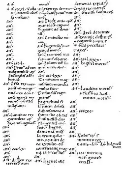 The Annales Cambriae (Latin for Annals of Wales) is the title given to a complex of Latin chronicles compiled or derived from diverse sources at St David's in Dyfed, Wales. The earliest is a 12th-century presumed copy of a mid-10th-century original; later editions were compiled in the 13th century. Despite the name, the Annales Cambriae record not only events in Wales, but also events in Ireland, Cornwall, England, Scotland and sometimes further afield, though the focus of the events recorded especially in the later two-thirds of the text is Wales.