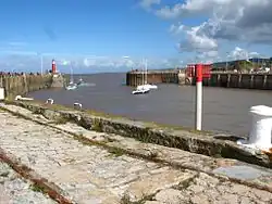 Although the outward terminal of the line was to be the quay at Watchet, the west pier had been practically unusable for some considerable time, and boats were beached and loaded direct from carts brought on to the foreshore.[30] After considerable public pressure, the Watchet Harbour Act 1857 (20 & 21 Vict. c. cxli) was passed, placing the harbour under the control of commissioners; they built a new east pier and rebuilt the west pier; the work was finished in 1862, and 500 ton vessels could enter the harbour.[31] The WSMR used the west pier, and the newly arrived, broad gauge West Somerset Railway, a branch from the Bristol and Exeter Railway, used the east pier.[32][33][34]