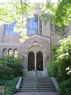 Western was established as the Northwest Normal School, a teachers' school predominantly for women although men also enrolled, by Phoebe Judson in Lynden, Washington, in 1886.[16] Eventually the school moved to Bellingham (then "New Whatcom"), and through the efforts of William R. Moultray and George Judson (Phoebe's son).[17] Governor John McGraw signed legislation establishing the New Whatcom Normal School on February 24, 1893. In November 1895, construction began on a permanent school building, now known as Old Main, the current administration building. Designed by prominent Seattle architects Warren Skillings & James Corner, it was completed by early 1897 but could not be opened to students until funds could be secured to install heating, lighting, and to do general grounds maintenance, which were not included in the original contract.[18] The first official class entered in 1899, composed of 88 students.
