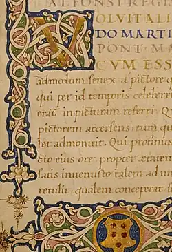 The decoration consists of entangled white vines, usually contrasted with a colourful background. The stems themselves are often simply parchment left unpainted. It became popular among Florentine illuminators in the early 15th century, as a conscious imitation of forms found in Romanesque illuminated manuscripts, thought at the time to be antique forms. For this reason, it was considered suitable to use white vine-stems to decorate texts by classical authors and humanist books.[1][2] From Florence the use of white vine-stems as a decorative element later spread to Rome and Naples, not least through the prolific work of Gioacchino de’ Gigantibus, during the second half of the century.[3]