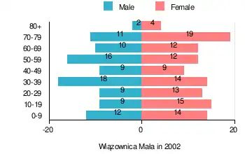 According to the 2002 Poland census, there were 208 people residing in Wiązownica Mała village, of whom 46.2% were male and 53.8% were female. In the village, the population was spread out, with 22.6% under the age of 18, 31.3% from 18 to 44, 20.2% from 45 to 64, and 26% who were 65 years of age or older.[1]