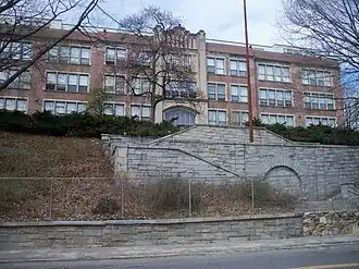 Waterbury's first Wilby High School building is located in a residential area north of downtown Waterbury, on 2.5 acres (1.0 ha) of land between Grove Street to the south and Pine Street to the north. The three-story masonry building is set into a steeply sloping hillside, with ground-level entrances on several levels. The main entrance is on the south facade, accessed via a series of terraced stairs. The building is roughly square, measuring 190 by 196 feet (58 m × 60 m). Tudor Revival features include the monumental main entrance surround, as well as the secondary entrances on Pine Street. The interior follows a "hollow square" plan, with a square of hallways, classrooms and offices on the outside walls, and gymnasiums and auditorium in the central space.[2]