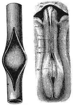 His's drawing comparing a chick embryo to a slit rubber tube, 1874. He argued that the shapes of structures are dictated mechanically when one part grows more than another, in opposition to Haeckel.