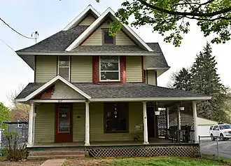 The William A. and Ida C. Johnson House is a historic residence located in Oskaloosa, Iowa, United States. The Johnsons, who were farmers, moved to town so that their children could attend Quaker schools there. This was typical of many Quaker families of that era.[2] Other family members also boarded with them so they too could attend the schools. William Johnson also served on the William Penn College Board of Trustees and served as its president from 1915 through 1922. It was during his tenure that the Main Building was destroyed by fire and the college moved to its present location. This Queen Anne style house is a 2½-story, frame, single-family dwelling. It features a wrap-around full-width porch with a gable-end entryway and a bay window on the main facade. The house is capped with a complex roof of intersecting steeply pitched gables. It is the Johnsons' association with the school in the context of the Quaker testimony in Oskaloosa that makes this house historic.[2] It was listed on the National Register of Historic Places in 1996.[1]