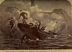 Cushing discovered two 30-foot (9.1 m) picket boats under construction in New York and acquired them for his mission.[8] On each he mounted a 12-pound Dahlgren howitzer and a 14-foot (4.3 m) spar projecting into the water from its bow. One of the boats was lost at sea during the voyage from New York to Norfolk, Virginia, but the other arrived safely with its crew of seven officers and men at the mouth of the Roanoke. There, the steam launch's spar was fitted with a lanyard-detonated torpedo.