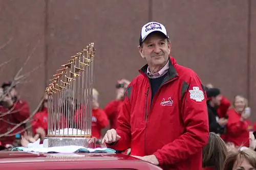 In 1995, DeWitt and Stephen F. Brauer purchased the St. Louis Cardinals from Anheuser-Busch for $150 million.[6] He oversees all league, financial, operational and baseball affairs for the club.[2] Since DeWitt bought the team, the Cardinals have won two World Series (2006 and 2011), four National League pennants, 11 division titles, and have made 15 total playoff appearances.[7] Forbes estimated that the team was worth $1.4 billion in 2014 and $2.1 billion in July 2019.[8] The Cardinals are one of the largest privately held firms in St. Louis, bringing in an estimated $233 million in revenue in 2012.[9]