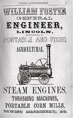 The company was known for producing threshing machines, regarded as among the best available. From 1889 they also made traction engines,[1] such as the Foster Wellington and Showman's road locomotives.[1]