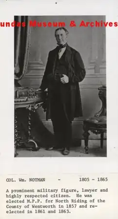Notman was born in Scotland in 1805, studied at the University of Glasgow and came to Dundas in Upper Canada in 1821. He studied law with George Ridout in Toronto, was called to the bar in 1827 and set up practice in Ancaster. His first wife and family died of diphtheria in 1832. In 1835, he moved to Dundas, where he married Janet Wilson. Notman represented Middlesex in the Legislative Assembly of the Province of Canada from 1848 to 1851 and the North riding of Wentworth from 1858 to 1865. He also served as a lieutenant colonel in the local militia.