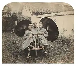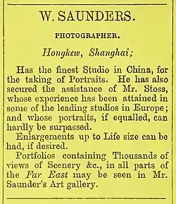 Saunders was born in Britain in 1832, and first travelled to China in 1860 as an engineer.[4] He then returned to Britain, studied photography, and returned again to China with photographic equipment, where he opened one of Shanghai's first photography studios in January 1862.[3] Located near the famous Astor House Hotel at the centre of Shanghai's commercial hub, Saunders' studio became the city's leading photographic studio.[5] Saunders' studio was to remain open for twenty-five years, a testament to his "considerable photographic talent [combined] with business acumen and marketing flair."[6] Although chiefly a portrait photographer, Saunders' fascination with China led him to photograph current events, local scenery and the local population.[7]