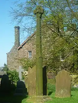 Grave Stone Memorial for W S Calverley at St. Kentigern's Church, Aspatria, designed by his friend and colleague, W. G. Collingwood, and based on the Dearham Cross[2]