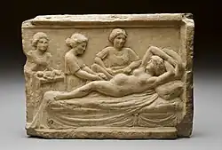 Hospitals did not exist during antiquity so delivery took place in the home of the expectant mother with a midwife and other assistants to the midwife. Religion played a major role during labor and delivery. Women called upon Artemis, a goddess with the ability to bring new life into the world as well as the ability to take it away. Though she remained a virgin herself, it was said that she witnessed the pain of her mother during the birth of her brother, Apollo, and immediately assumed the position of midwife. If a woman died during childbirth, her clothes were taken to the temple of Artemis due to the fact the woman's death was attributed to her.[17] If the birth was successful, the mother would make an offering of thanks by sacrificing some of her clothes to the goddess as well.[18]
