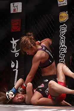 While mixed martial arts is primarily a male dominated sport, it does have female athletes.[1][2][3] For instance, Female competition in Japan includes promotions such as DEEP Jewels. Now defunct promotions that featured female fighters were Valkyrie, and Smackgirl.[4] Professional mixed martial arts organizations in the United States that invite women to compete are industry leader Ultimate Fighting Championship, the all female Invicta Fighting Championships, Resurrection Fighting Alliance, Bellator Fighting Championships, and Legacy Fighting Championship. Now defunct promotions that featured female fighters were Strikeforce and EliteXC.[5] There has been a growing awareness of women in mixed martial arts due to popular female fighters and personalities such as Amanda Nunes, Megumi Fujii, Gina Carano, Ronda Rousey, Miesha Tate, Holly Holm, Alexa Grasso, and Joanna Jędrzejczyk and among others.[6] Carano became known as "the face of women's MMA" after appearing in a number of EliteXC events.[7][8][9] This was furthered by her appearances on MGM Television's 2008 revival of their game show American Gladiators.[10][11][12][13]