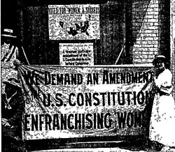 Prospects for a national amendment looked dim at the turn of the century, and progress at the state level had slowed.[4] In the 1910s, however, the drive for a national amendment was revitalized, and the movement achieved a series of successes at the state level. The newly formed National Woman's Party (NWP), a militant organization led by Alice Paul, focused almost exclusively on the national amendment. The larger NAWSA, under the leadership of Carrie Chapman Catt, also made the suffrage amendment its top priority.[5] In September 1918, President Wilson spoke before the Senate, asking for the suffrage amendment to be approved. The amendment was approved by Congress in 1919 and by the required number of states a year later.[6]