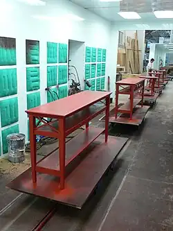 In this towline method, mobile carts move large furniture through various finishing stages on a conveyor system.