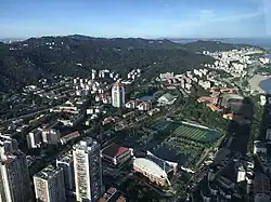 Panoramic view of Xiamen University, with new campus in the foreground and the original campus near the beach